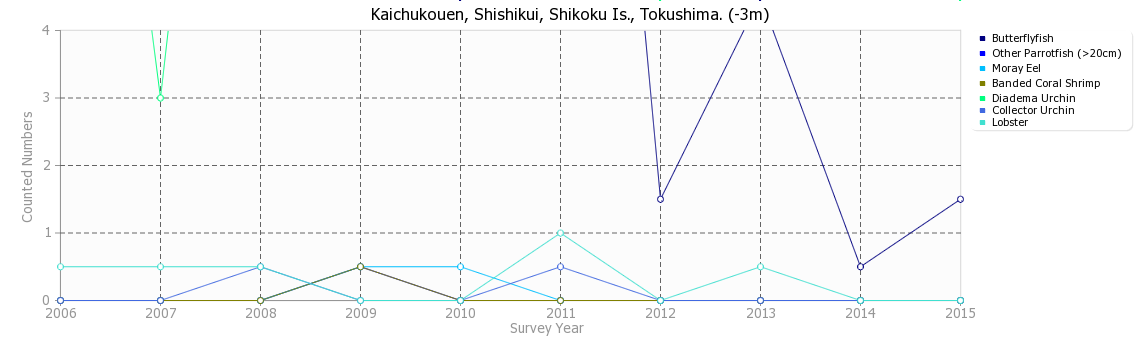 カウントなし:フエダイ類, サラサハタ, メガネモチノウオ, カンムリブダイ, ブダイ類(20cm以上), ウツボ類, シラヒゲウニ, ナマコ類, オニヒトデ, シャコガイ類, ホラガイ
