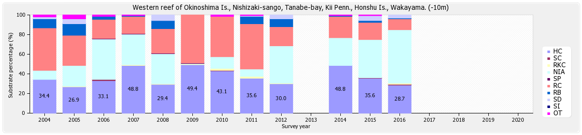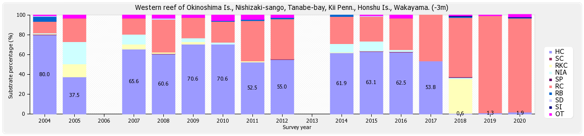 リーフチェック 紀伊半島 田辺 西崎サンゴ・沖ノ島西 (和歌山県) 底質分類の経年変化